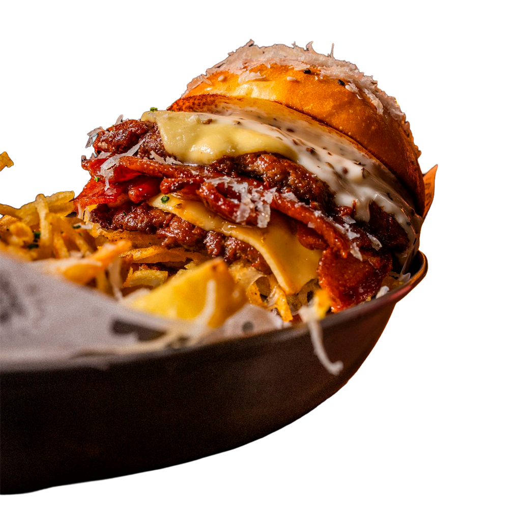 Smash beef patty, truffle parmesan, pepper ranch sauce, crispy onions